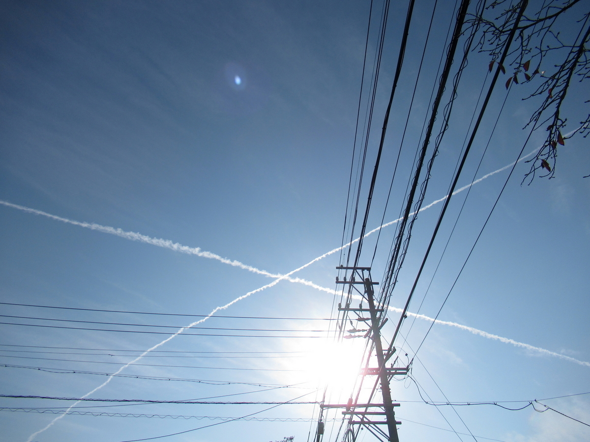 県道西進、空を見上げると JET雲がカーブを描いていて取材。妙なカーブだった。